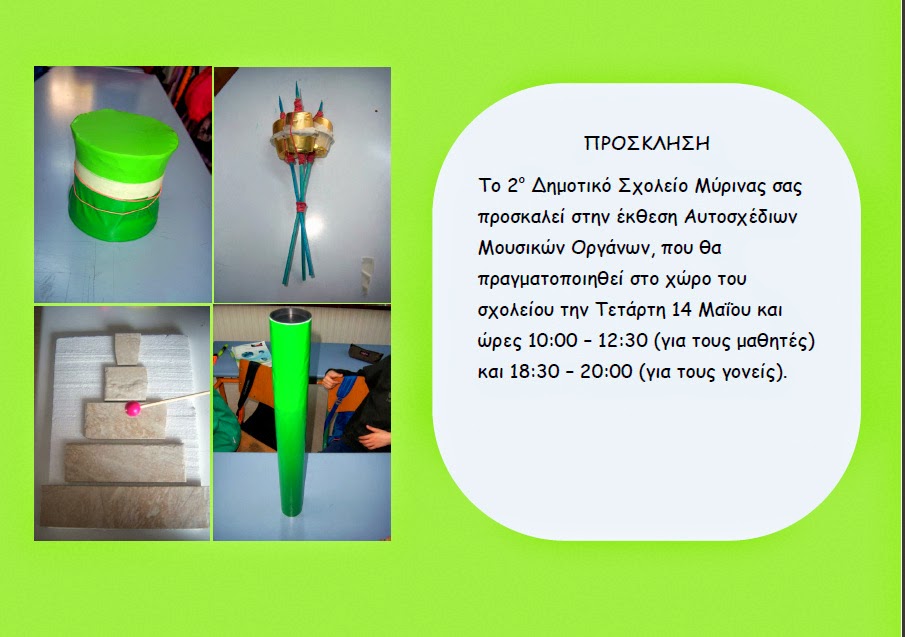 Επίσης, η κ. Τζαννέτου μας ενημέρωσε για την Έκθεση Αυτοσχέδιων Μουσικών Οργάνων, η οποία θα πραγματοποιηθεί σήμερα στο χώρο του σχολείου.