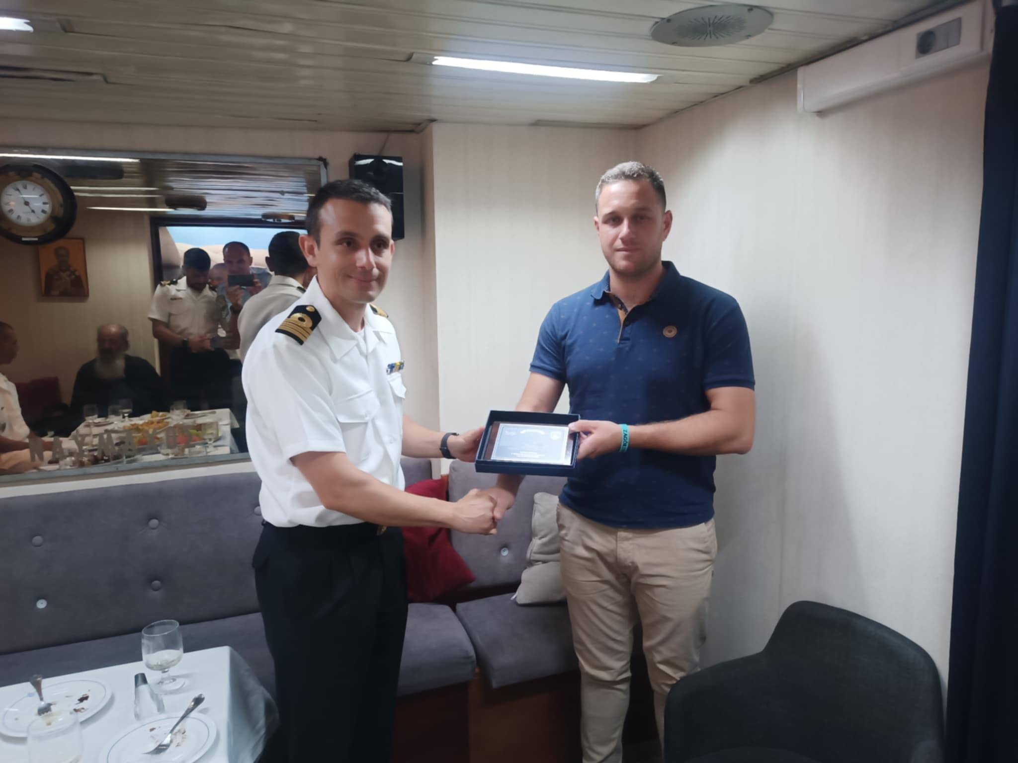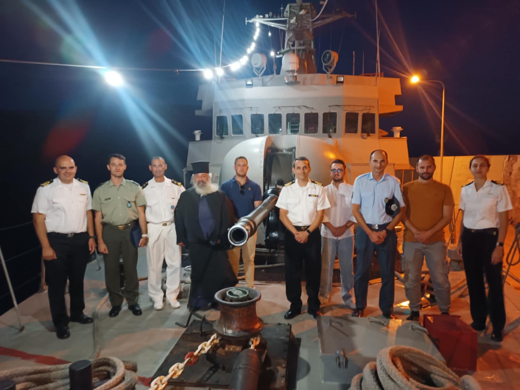Εκπρόσωποι των τοπικών αρχών και φορέων, μεταξύ των οποίων ο Πρόεδρος του Δημοτικού Συμβουλίου Δημήτρης Κουτρούλης, ο Ιερέας του νησιού π. Ιωάννης Γκέκας, καθώς και στελέχη των Σωμάτων Ασφαλείας και του Π.Π.Ι. Αγίου Ευστρατίου, ξεναγήθηκαν στην κανονιοφόρο από τον Πλωτάρχη και Κυβερνήτη του πλοίου, κ. Κωνσταντίνο Γκίκα και το πλήρωμα. Ακολούθησε δεξίωση επί του πλοίου σε θερμό και συγκινητικό κλίμα.