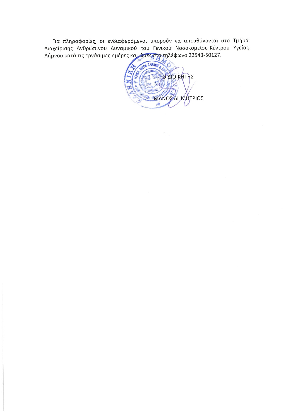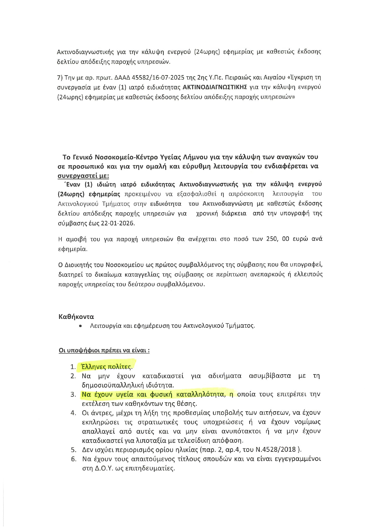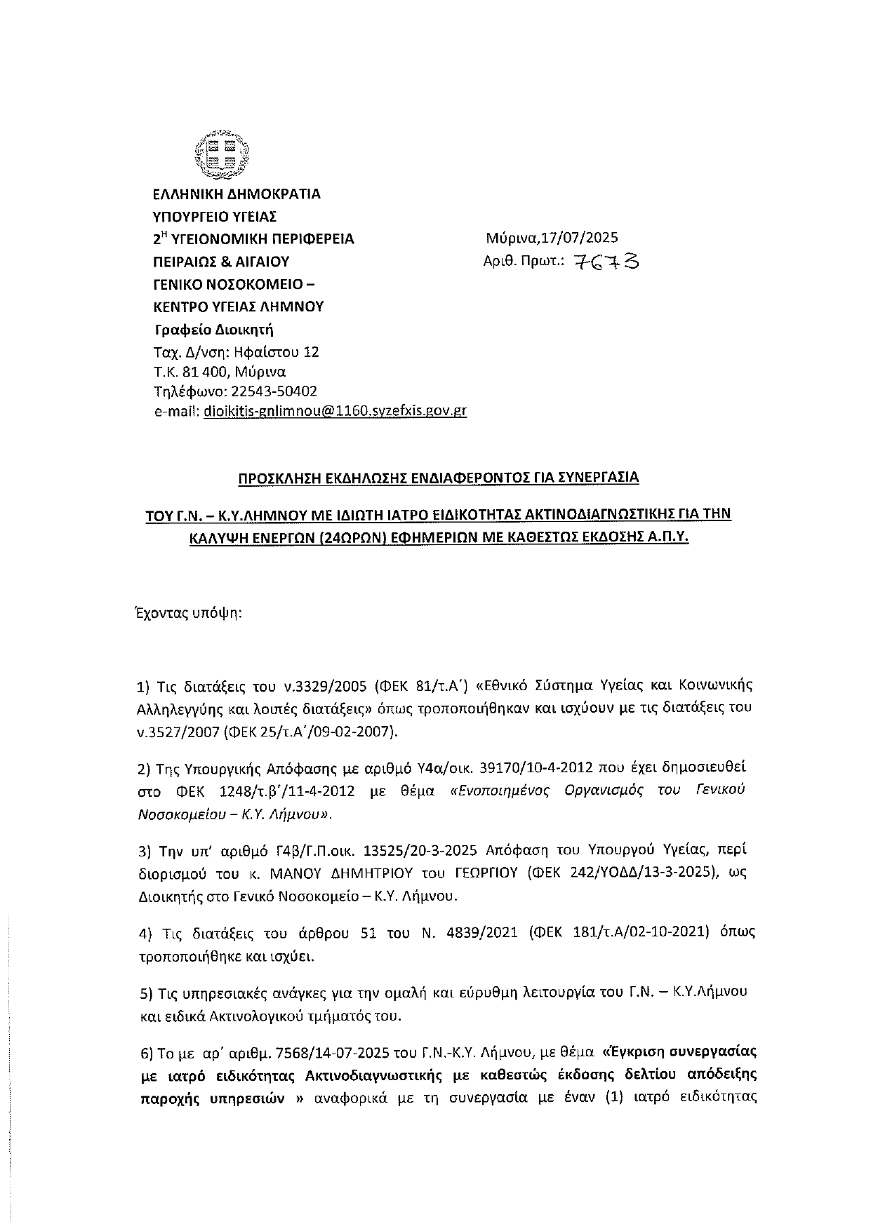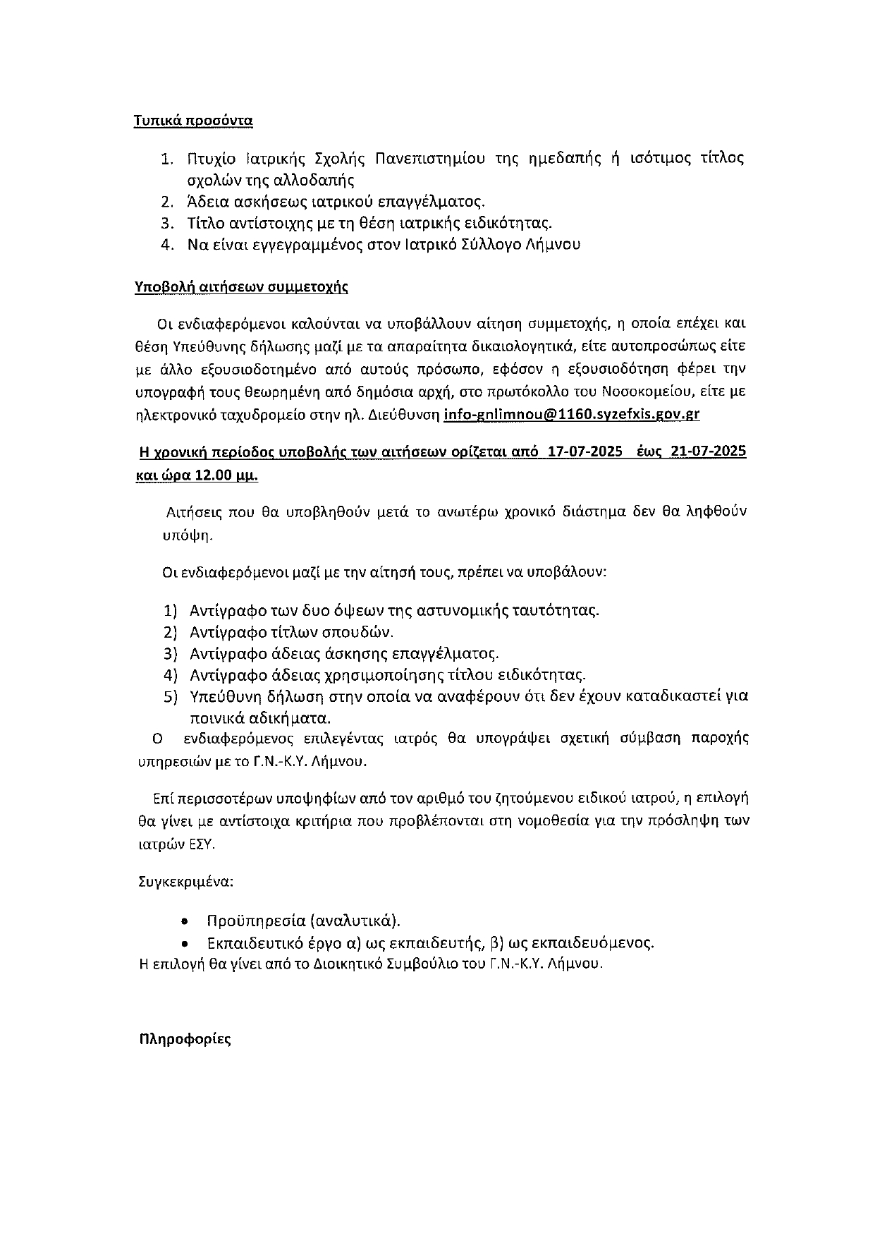 Η πρόσκληση εντάσσεται στο πλαίσιο της ενίσχυσης του τομέα Υγείας στο νησί και της κάλυψης των αναγκών του Γενικού Νοσοκομείου Λήμνου με κατάλληλο επιστημονικό προσωπικό.