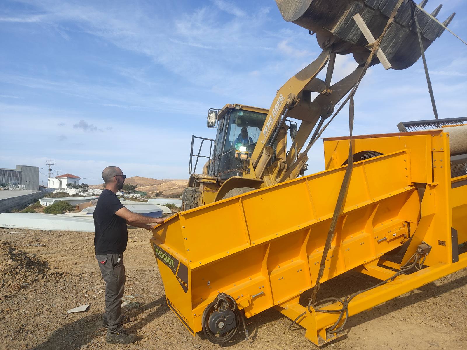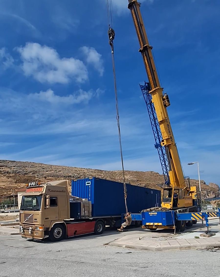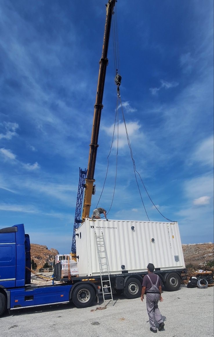 Ειδικός γερανός ξεφόρτωσε και τοποθέτησε τα 2 containers της μονάδας σε ειδικά διαμορφωμένες βάσεις. Δρομολογείται τις αμέσως επόμενες ημέρες η σύνδεση της μονάδας με τα δίκτυα θαλασσινού νερού, πόσιμου νερού και ηλεκτρικού ρεύματος. Μετά την ολοκλήρωση των εργασιών θα ξεκινήσει η παραγωγή νερού προς κατανάλωση.