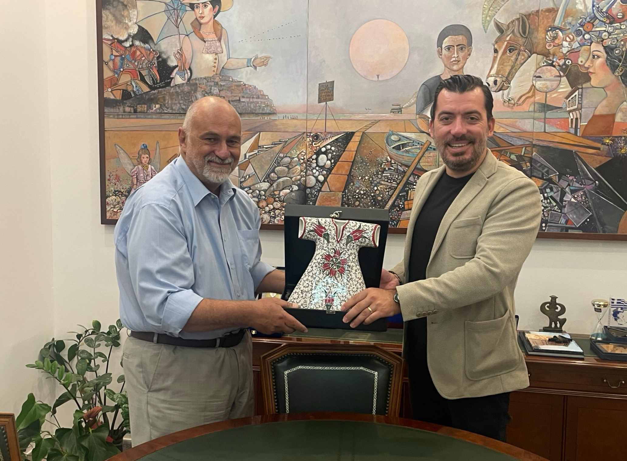 Στη συνέχεια ο κ. Aydin προσέφερε στον Αντιδήμαρχο ένα αναμνηστικό δώρο, το οποίο απεικονίζει ένα παραδοσιακό καφτάνι της περιοχής τους. Σήμερα, Κυριακή 7 Σεπτεμβρίου, ο κ. Μπουλώτης συνόδευσε την αποστολή στην επίσκεψη που πραγματοποίησε στο Μουσείο Παιδικού Παιχνιδιού & Βιβλίου στη Μύρινα, ενώ αύριο, Δευτέρα 8 Σεπτεμβρίου, η Ένωση Ξενοδόχων Λήμνου έχει προσκαλέσει τους επιχειρηματίες και φορείς του τουρισμού της Λήμνου, σε Β2Β συνάντηση με την παραπάνω αντιπροσωπεία, η οποία θα πραγματοποιηθεί 18:00 με 20:30 στο Ξενοδοχείο Varos Village.