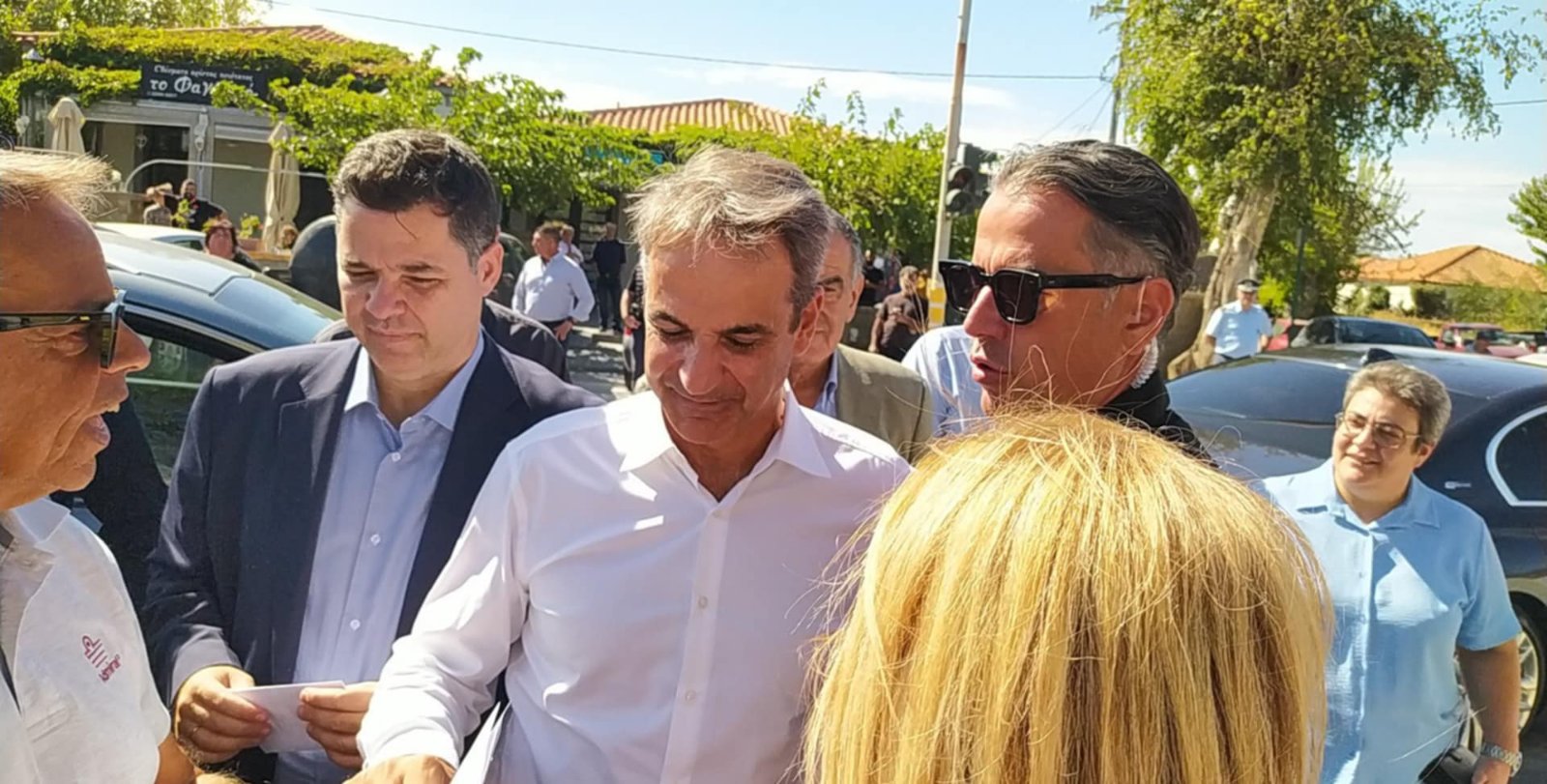 Οι συγκεντρωμένοι υποδέχθηκαν τον πρωθυπουργό με πανό και συνθήματα, όπως «Εσείς μετράτε κέρδη και ζημιές – εμείς μετράμε ανθρώπινες ζωές», «Αγρότη πολέμα – σου πίνουνε το αίμα», «Θέλουμε καράβια να φτάνουν στα νησιά – όχι στα κέρδη τα εφοπλιστικά», «Η ανάπτυξή τους τσακίζει τη ζωή μας - Οργάνωση κι αγώνας, η απάντησή μας», «Μέτρα προστασίας ζητάει ο λαός - να ζήσουμε στους τόπους μας αξιοπρεπώς», «Πνιγμένοι στις βροχές, καμένοι στις φωτιές - κόστος δεν είναι οι ανθρώπινες ζωές». Επίσης ακούστηκε το «λευτεριά στην Παλαιστίνη» και να μην συγκαλυφθεί το έγκλημα στα Τέμπη.