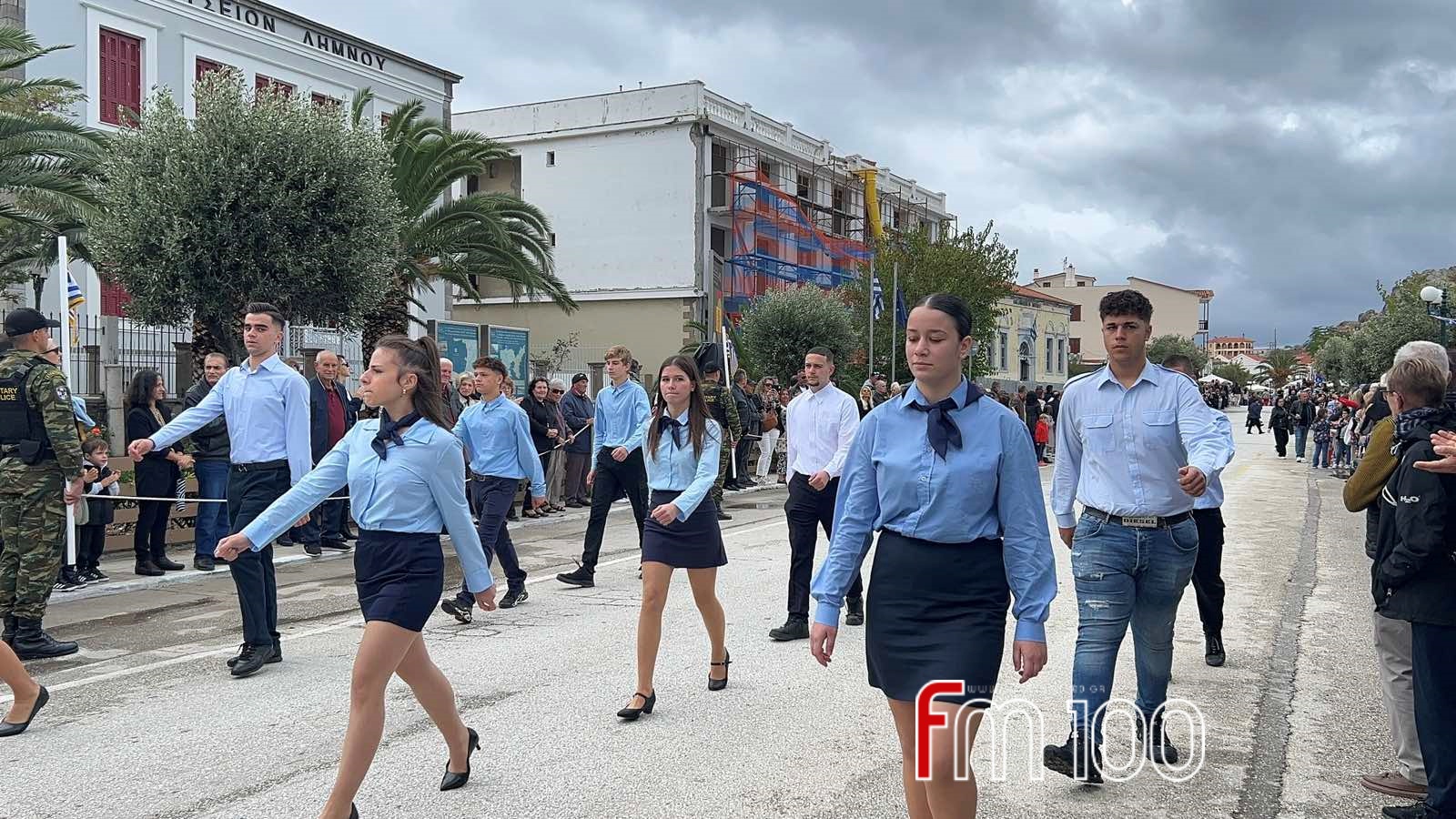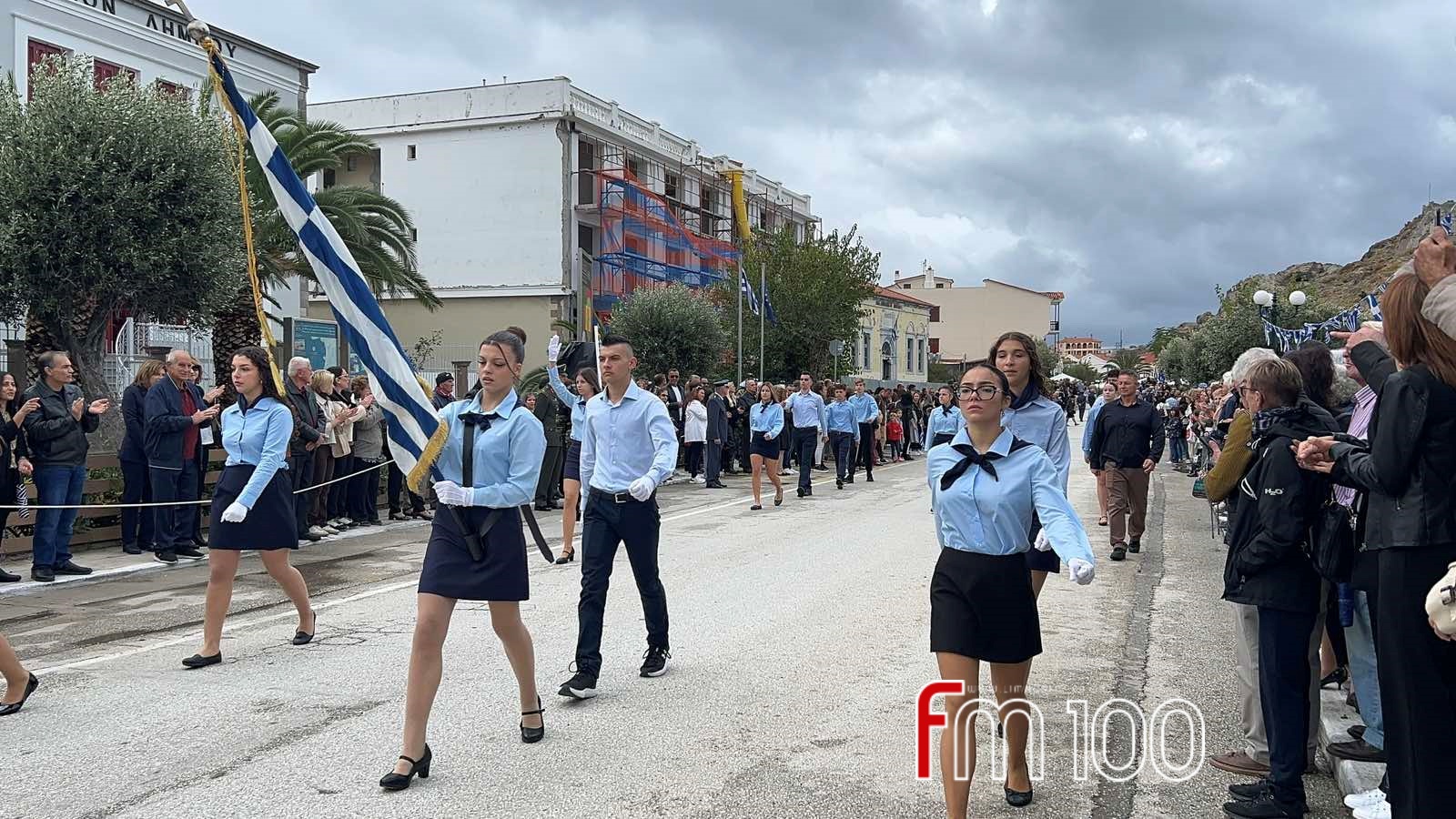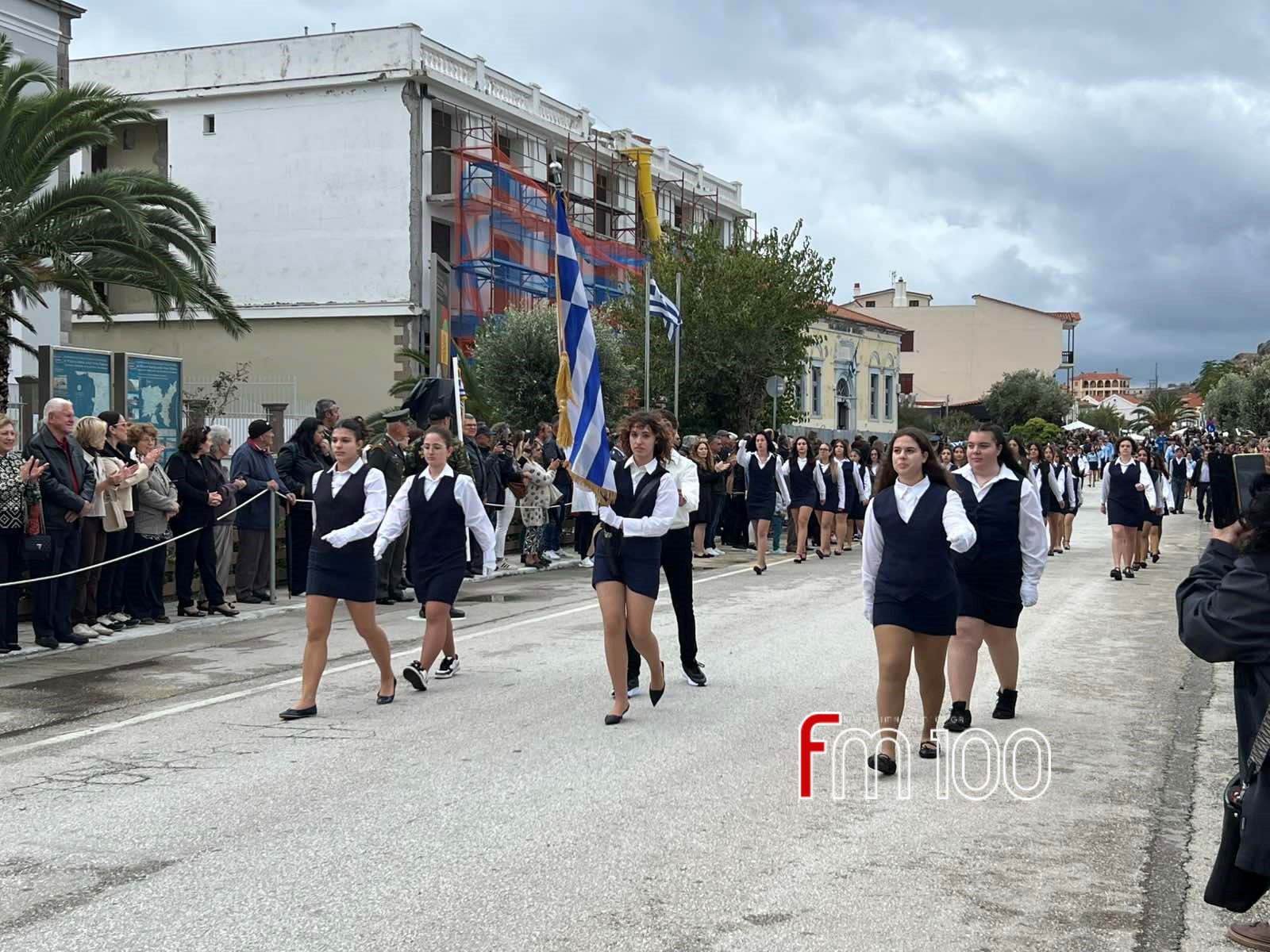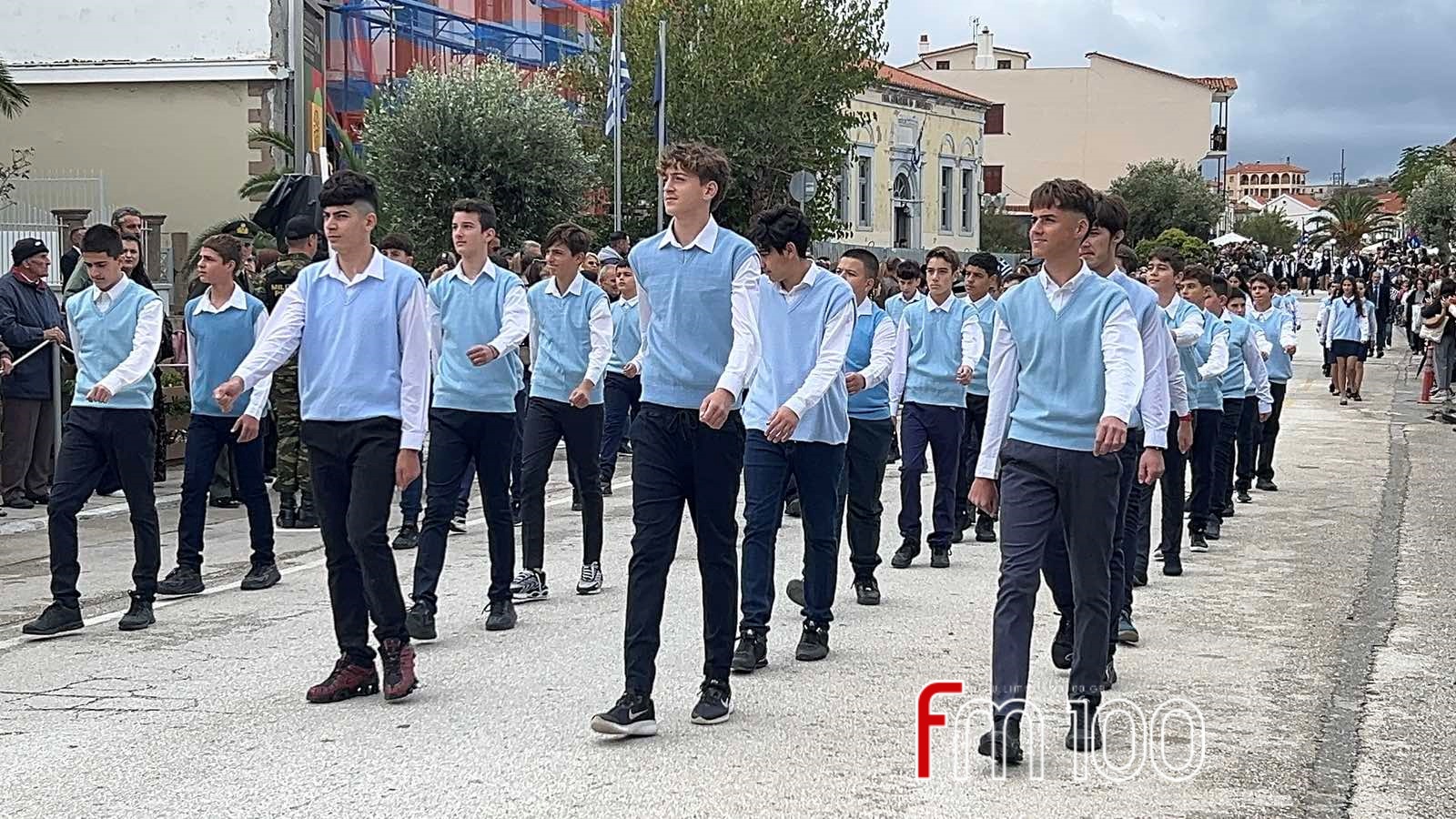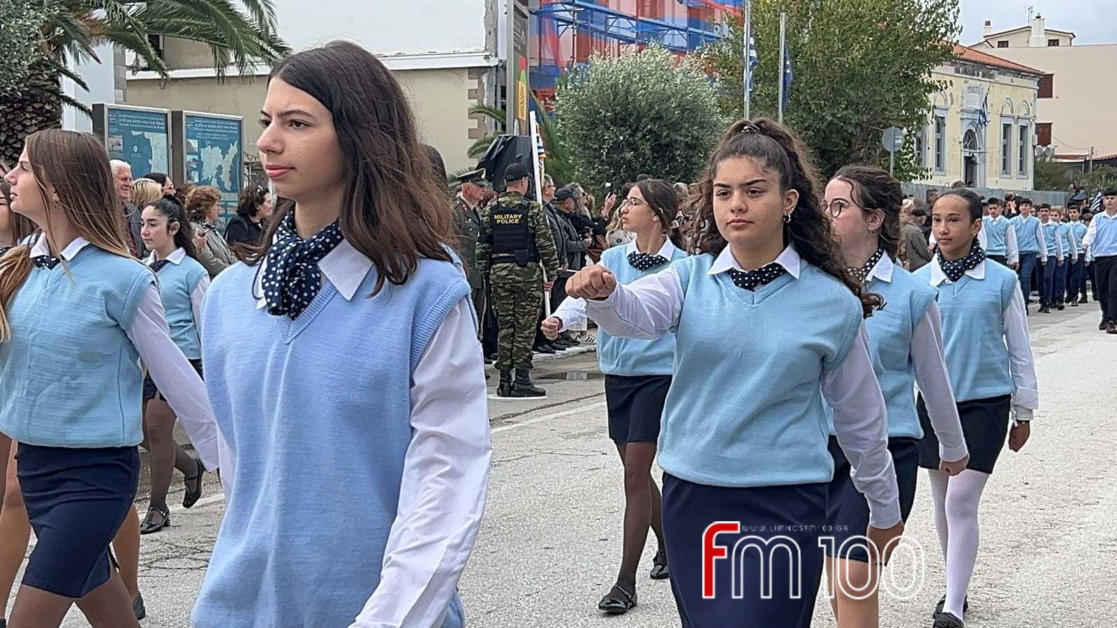 Ακολούθησε η μαθητική παρέλαση στο Ρωμαίικο Γιαλό την οποία παρακολούθησαν ο Πρόεδρος της Δημοκρατίας και οι επίσημοι προσκεκλημένοι. Στην παρέλαση συμμετείχαν μαθητές και μαθήτριες από τα σχολεία της πόλης, καθώς και πολιτιστικοί και αθλητικοί σύλλογοι του νησιού, προσφέροντας ένα ξεχωριστό θέαμα με παραδοσιακές φορεσιές και έντονο παλμό.