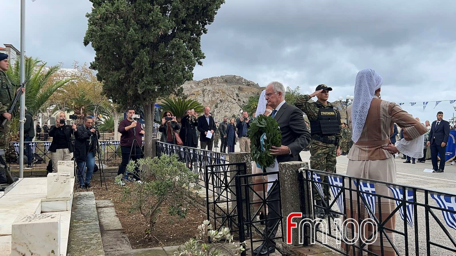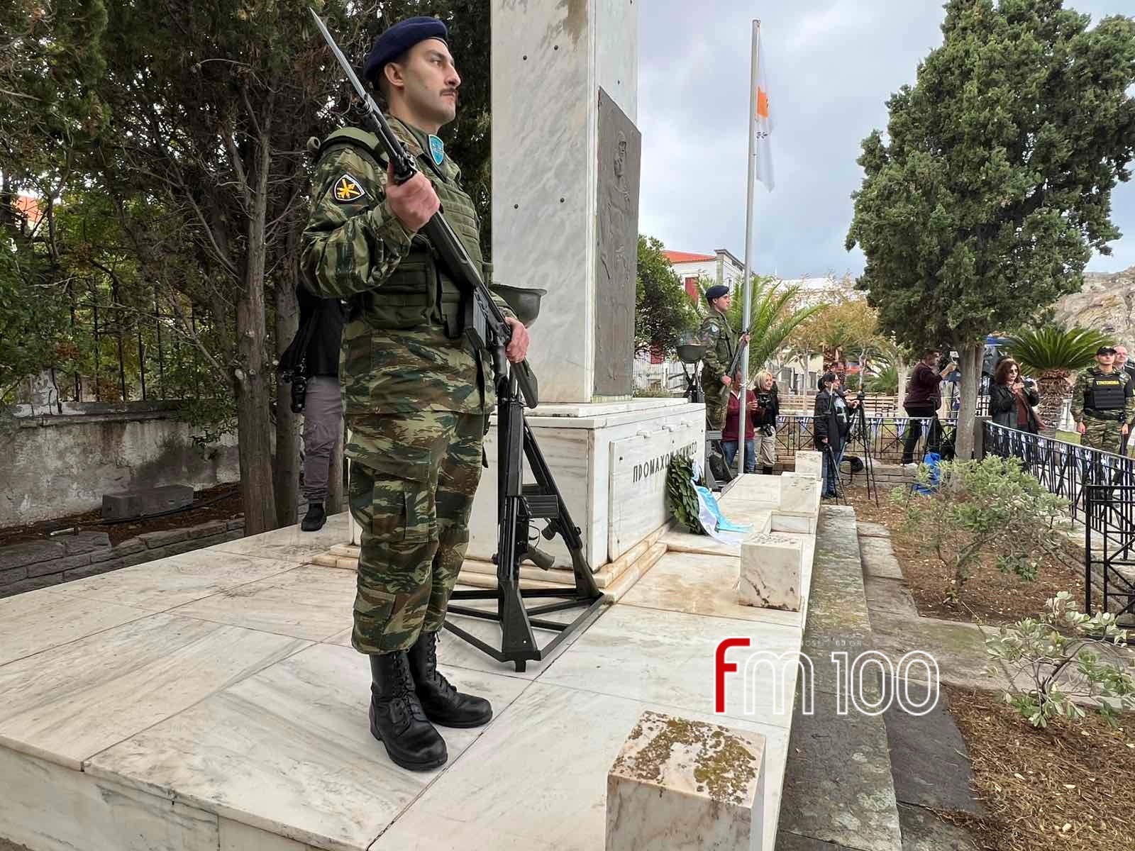 Αμέσως μετά, πραγματοποιήθηκε η τελετή κατάθεσης στεφάνων στο Ηρώο των Πεσόντων. Σύμφωνα με το επίσημο πρωτόκολλο, στεφάνι κατέθεσε μόνο ο Πρόεδρος της Δημοκρατίας, αποτίοντας φόρο τιμής σε όσους αγωνίστηκαν και θυσιάστηκαν για την ελευθερία του νησιού.