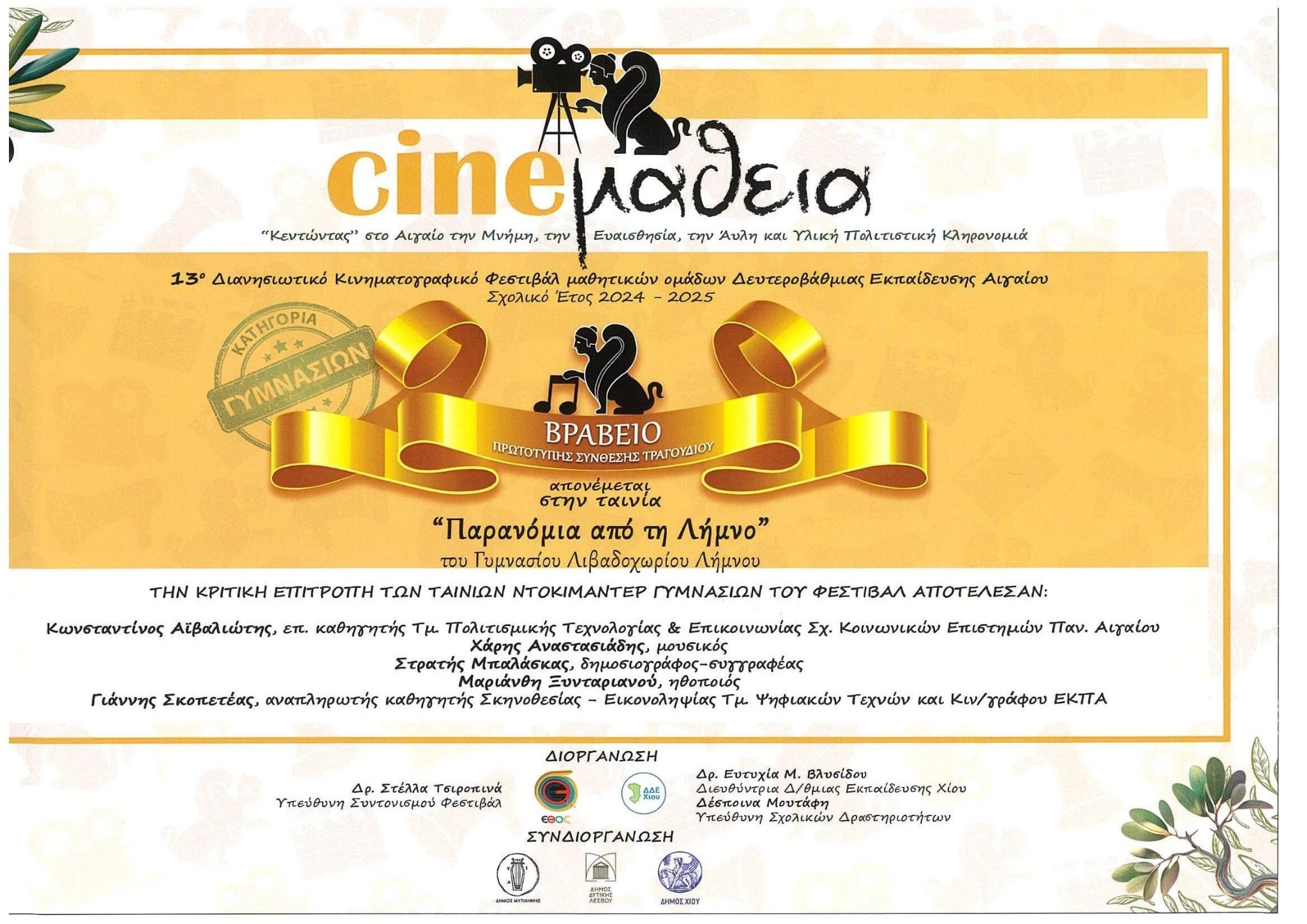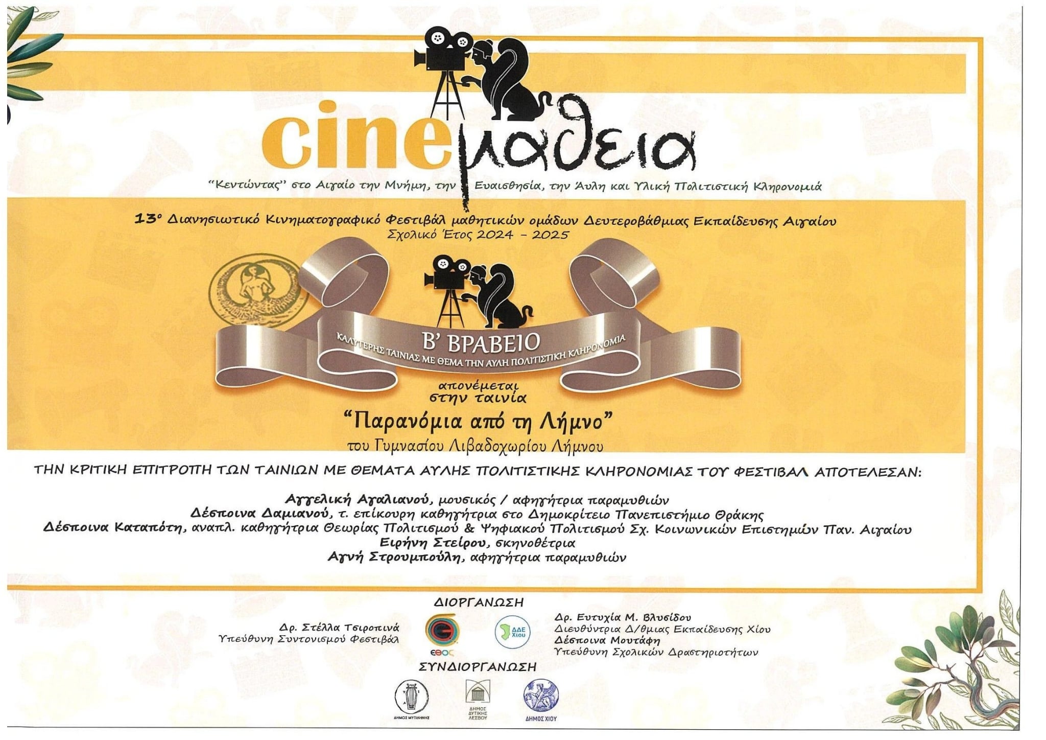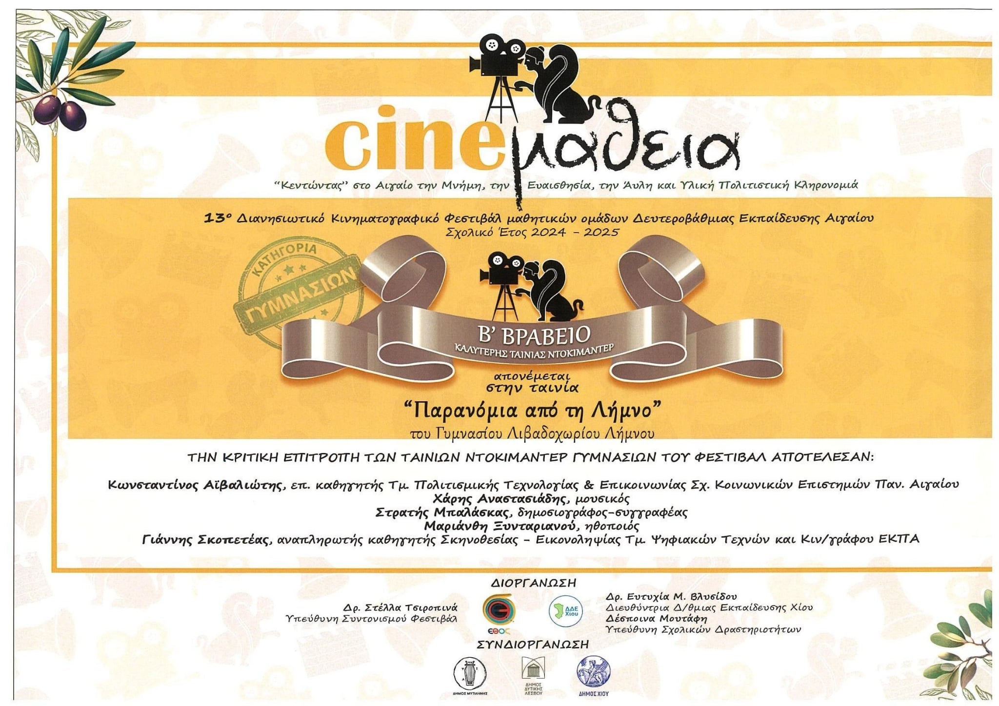 Το 13ο Διανησιωτικό Κινηματογραφικό Φεστιβάλ Αιγαίου «CINEμάθεια» 2025 πραγματοποιήθηκε τον φετινό Οκτώβρη στην Μυτιλήνη. Η τελετή βράβευσης, την Τρίτη 7 Οκτωβρίου, αποτέλεσε μια μεγάλη επιτυχία για την κινηματογραφική ομάδα του Γυμνασίου Λιβαδοχωρίου, καθώς απέσπασε πολλά βραβεία και επαίνους για την ταινία Ντοκιμαντέρ που δημιούργησε κατά τη σχολική χρονιά 2024-2025 με τίτλο “ΠΑΡΑΝόΜΙΑ από τη Λήμνο”.