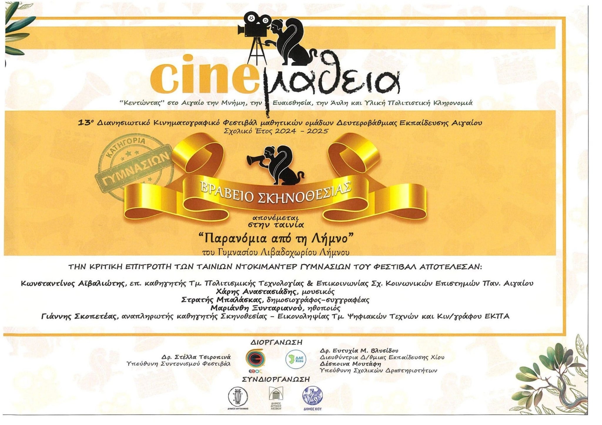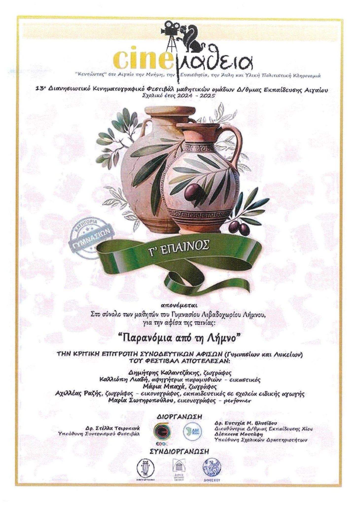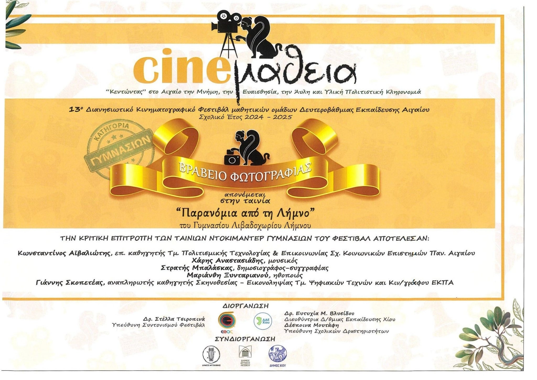 Το 13ο Διανησιωτικό Κινηματογραφικό Φεστιβάλ Αιγαίου «CINEμάθεια» 2025 πραγματοποιήθηκε τον φετινό Οκτώβρη στην Μυτιλήνη. Η τελετή βράβευσης, την Τρίτη 7 Οκτωβρίου, αποτέλεσε μια μεγάλη επιτυχία για την κινηματογραφική ομάδα του Γυμνασίου Λιβαδοχωρίου, καθώς απέσπασε πολλά βραβεία και επαίνους για την ταινία Ντοκιμαντέρ που δημιούργησε κατά τη σχολική χρονιά 2024-2025 με τίτλο “ΠΑΡΑΝόΜΙΑ από τη Λήμνο”.