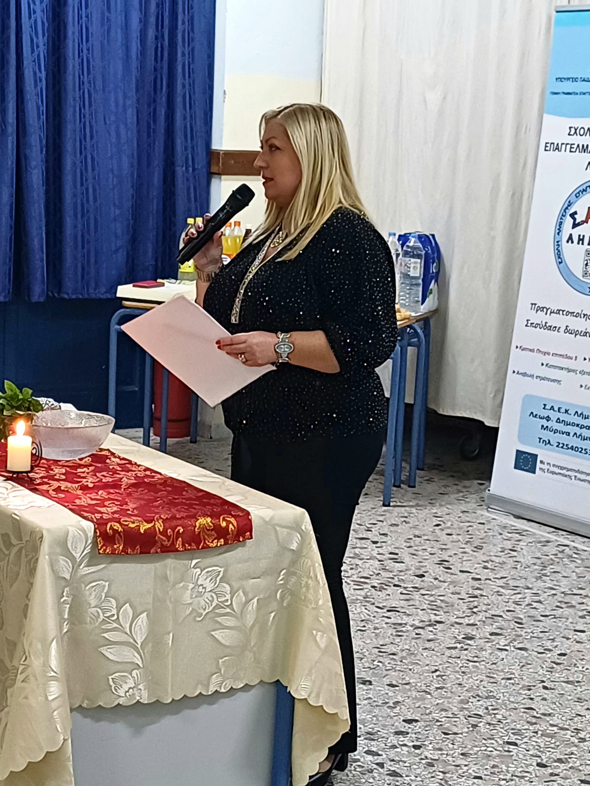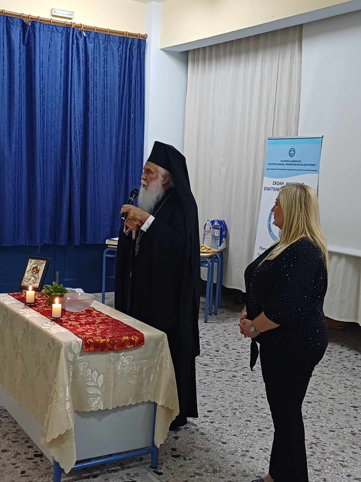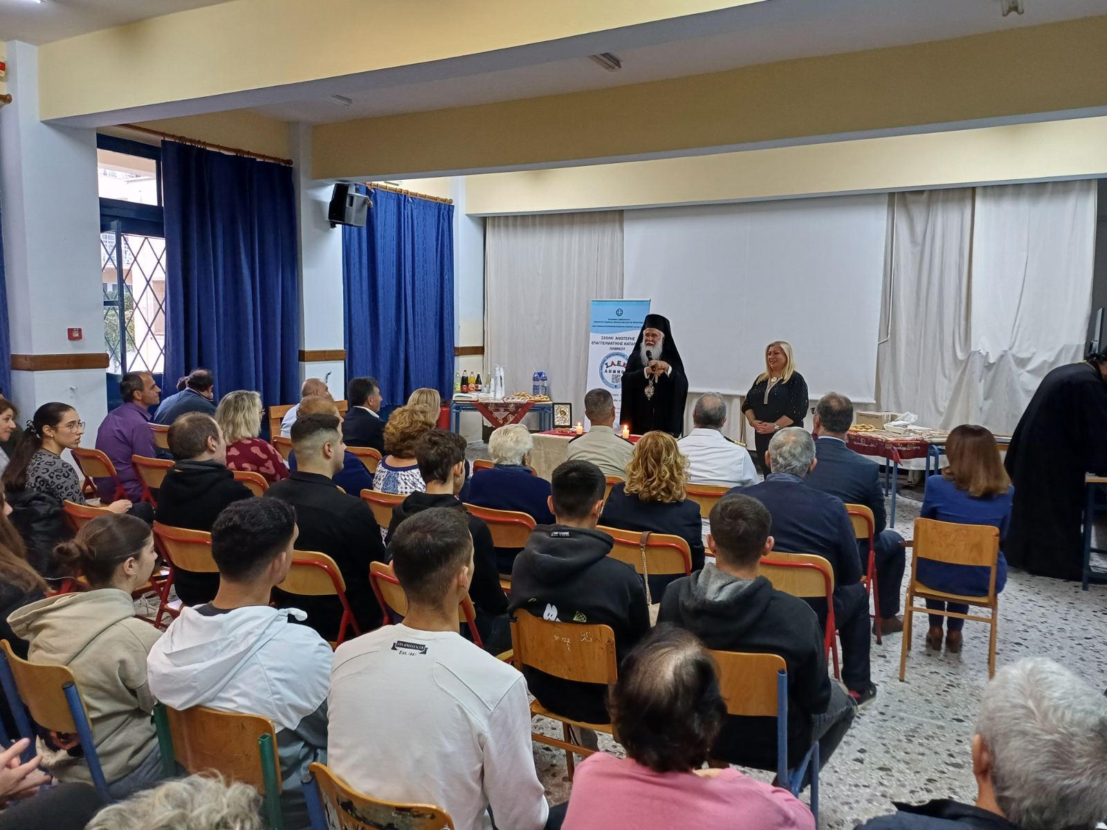 Η Διευθύντρια της ΣΑΕΚ Λήμνου, κα Ιουλία Λυγδά, ευχαρίστησε από καρδιάς τον Σεβασμιώτατο Μητροπολίτη κ.κ. Ἱερόθεο για την αγάπη, την ευλογία και τη σταθερή παρουσία του και στήριξη – καθώς για πέμπτη συνεχή χρονιά τελεί ο ίδιος τον Αγιασμό της Σχολής.