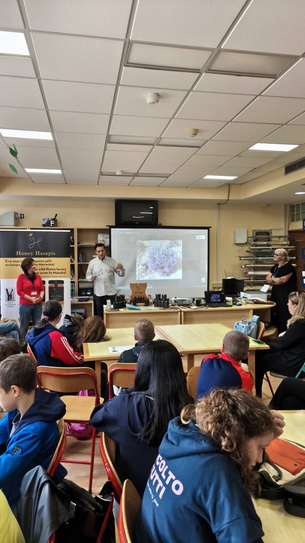 Ο κ. Χασάπης παρουσίασε τη διαδικασία παραγωγής μελιού, τη σημασία της μέλισσας για το οικοσύστημα και τη διατροφική και θεραπευτική αξία του μελιού!