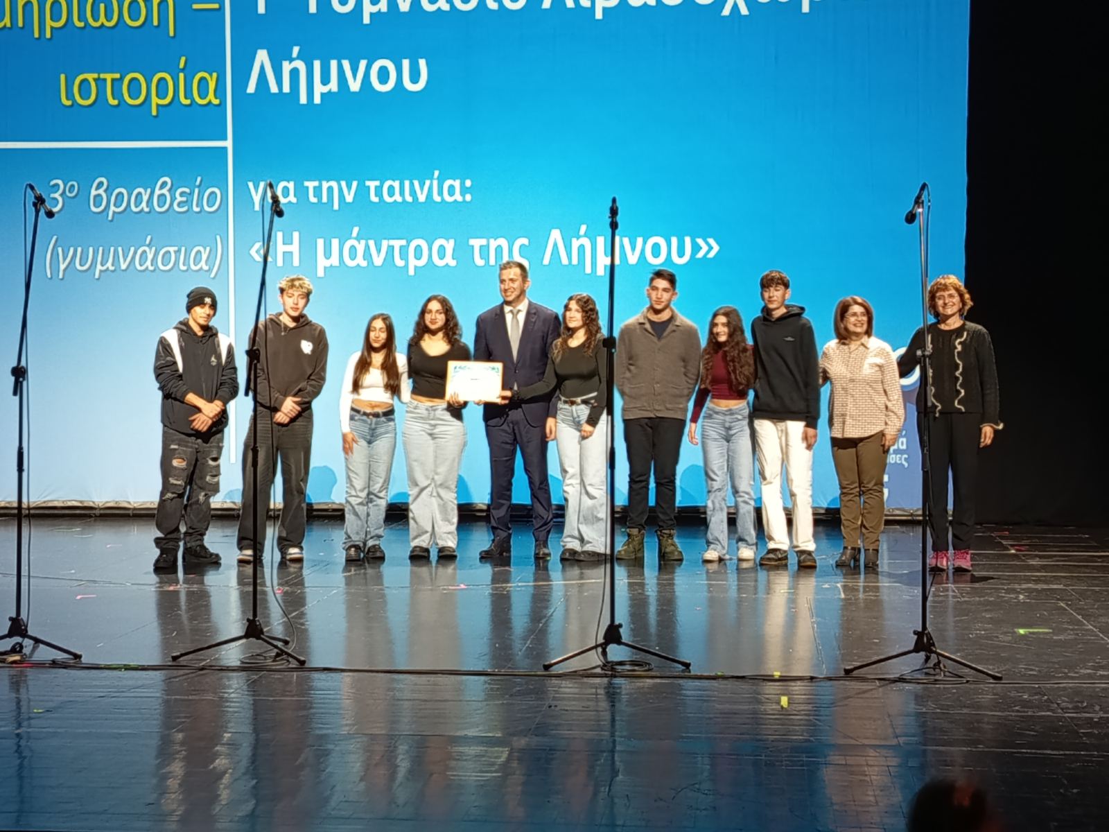 Στην κατηγορία Ντοκιμαντέρ Γυμνασίων (Ταινία Τεκμηρίωσης) με την ταινία «Η Μάντρα της Λήμνου» το Γυμνάσιο Λιβαδοχωρίου παρέλαβε από τον Γενικό Γραμματέα Επικοινωνίας και Ενημέρωσης κ. Δημήτρη Κιρμικίρογλου το 3ο Βραβείο.