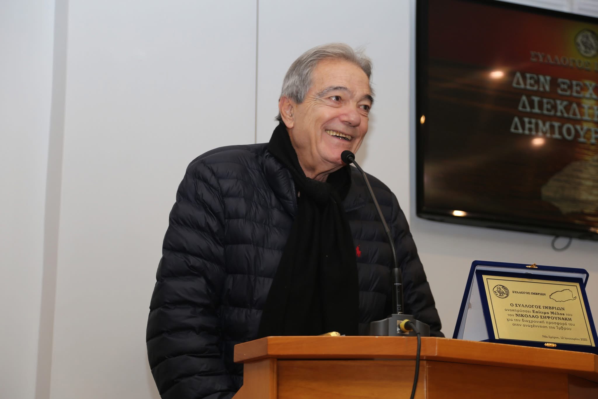 Στην αντιφώνησή του ο Ν. Σηφουνάκης ευχαριστώντας τον Σύλλογο μεταξύ άλλων είπε: «Η πρώτη μου επίσκεψη στην Ίμβρο έγινε τότε και ήταν υποχρεωτική η απόκτηση visa, για να πας. Έτσι γνώρισα την Ίμβρο, σε μια εποχή που υπήρχαν ελάχιστοι Έλληνες, και ο φόβος και τρομοκρατία κυριαρχούσαν. Πέρασαν πολλά χρόνια και είχα την ευλογία να γνωρίσω ανθρώπους με τους οποίους συνεργάστηκα πάρα πολύ και ένας από αυτούς, ήταν ο Σπύρος Μελετζής με τον οποίο πήγαμε πολλές φορές στην Ίμβρο, και ο παριστάμενος τότε Πρόεδρος του Συλλόγου σας ο Μ. Μαυρόπουλος το θυμάται.