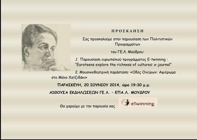 Την Παρασκευή, 20 Ιουνίου και ώρα 19:30 μ.μ θα πραγματοποιηθεί η παρουσίαση του ευρωπαϊκού προγράμματος E-twinning :“Euroteens explore the richness of cultures: e-journal” από τους μαθητές του Γ.Ε.Λ Μούδρου στην αίθουσα εκδηλώσεων ΓΕ.Λ. – ΕΠΑ.Λ. Μούδρου, ενώ στην ίδια αίθουσα την ίδια μέρα θα ακολουθήσει στις 20:30 μ.μ η μουσικοθεατρική παράσταση «Οδός ονείρων: αφιέρωμα στον Μάνο Χατζιδάκι» για τα 20 χρόνια από το θάνατο του μεγάλου συνθέτη.