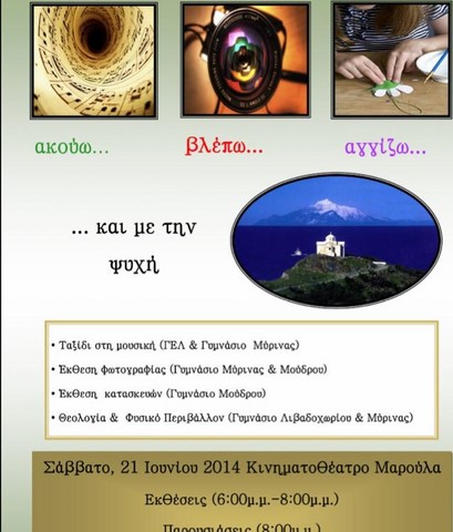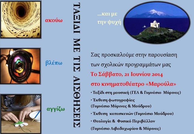 Το Σάββατο, 21 Ιουνίου θα πραγματοποιηθεί ακόμη μία εκδήλωση, αυτή τη φορά στο κινηματοθέατρο Μαρούλα, με παρουσίαση εκθέσεων από τις 6:00 μ.μ έως τις 8:00 μ.μ, ενώ θα ακολουθήσει η παρουσίαση των σχολικών προγραμμάτων του Γ.Ε.Λ και Γυμνασίου Μύρινας και του Γυμνασίου Μούδρου και Λιβαδοχωρίου.
