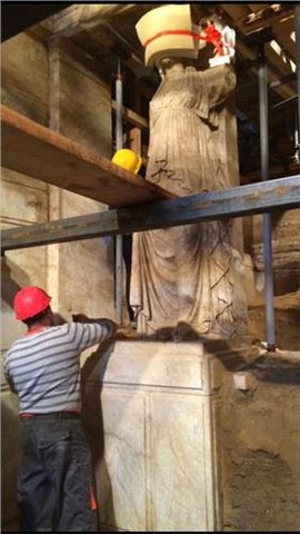 Οι φωτογραφίες που δόθηκαν στη δημοσιότητα την Τρίτη εντυπωσιάζουν, καθώς για πρώτη φορά αποκαλύπτονται στο σύνολο τους τα μαρμάρινα βάθρα πάνω στα οποία πατούν οι Καρυάτιδες, μετά την αφαίρεση των δύο τελευταίων δόμων του τοίχου σφράγισης, μπροστά από τον δεύτερο διαφραγματικό τοίχο.